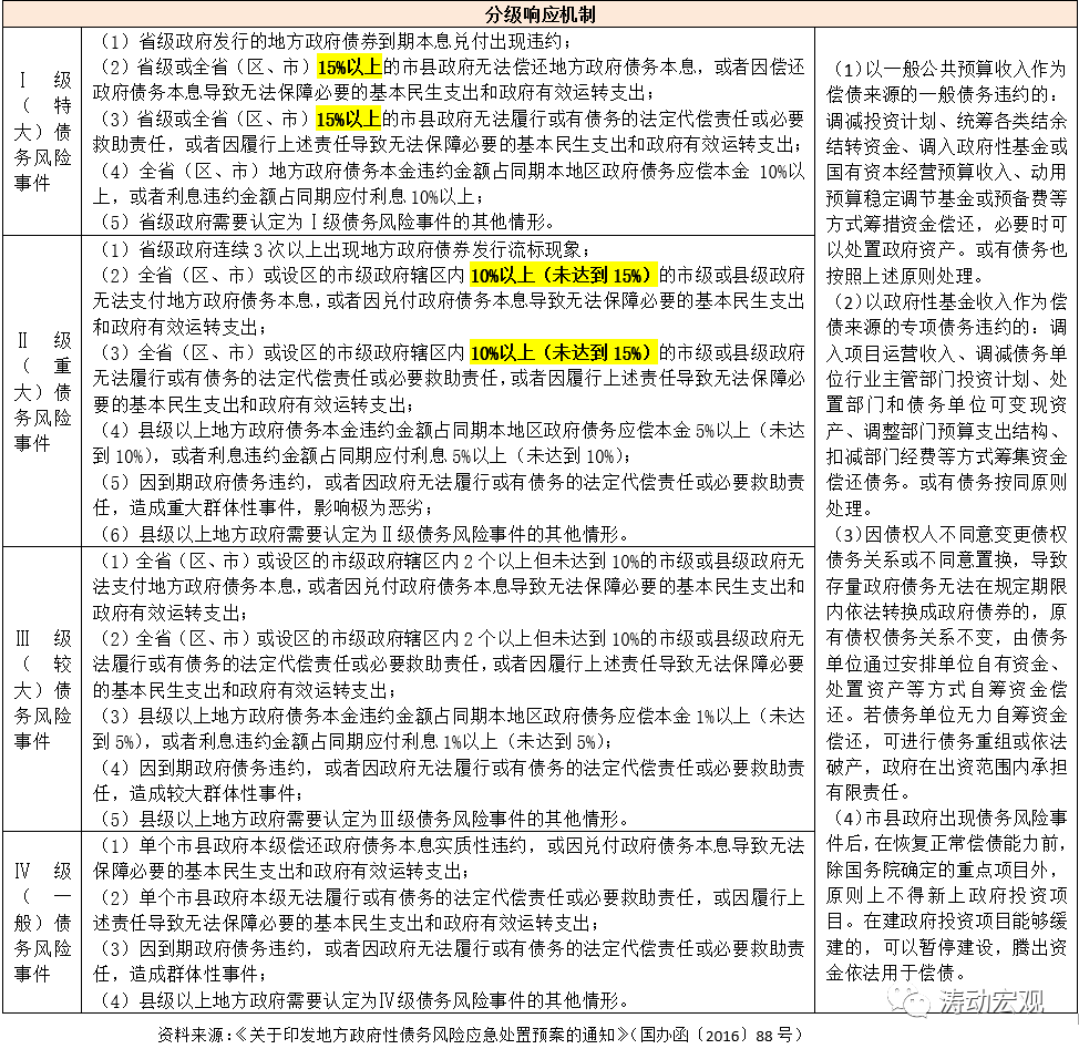 1、88號(hào)文提出,根據(jù)政府性債務(wù)風(fēng)險(xiǎn)事件的性質(zhì)、影響范圍和危害程度等情況,將風(fēng)險(xiǎn)級(jí)別劃分為I級(jí)(特大)、II級(jí)(重大)、III級(jí)(較大)、IV級(jí)(一般)四個(gè)等級(jí),實(shí)行分級(jí)響應(yīng)和應(yīng)急處置。