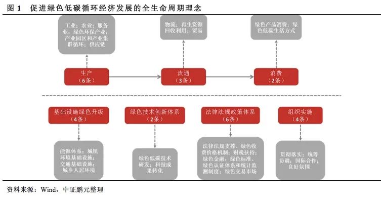 《指導意見》共30條,用全生命周期理念理清了綠色低碳循環發展經濟體系建設過程。前3條為指導思想、工作原則和主要目標,其余27條涉及生產到流通再到消費環節,還涉及基礎設施綠色升級、綠色技術創新、法律法規政策、組織實施等各個支持環節。