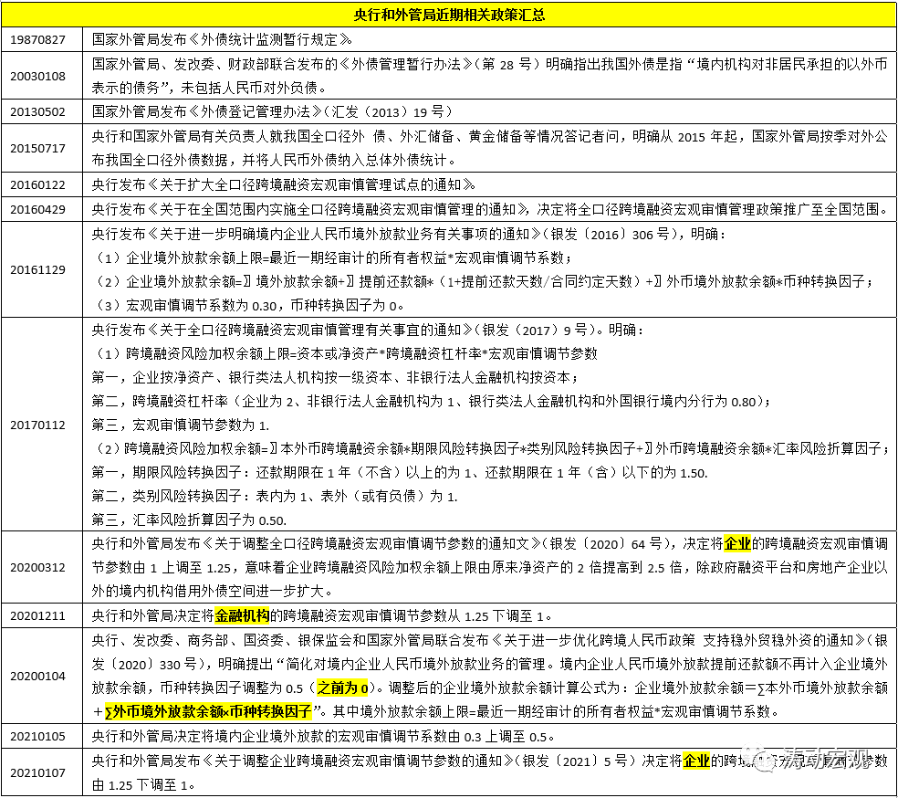 (2)2016年4月29日,央行發布《關于在全國范圍內實施全口徑跨境融資宏觀審慎管理的通知》,決定將全口徑跨境融資宏觀審慎管理政策推廣至全國范圍,并建立宏觀審慎規則下基于微觀主體資本或凈資產的跨境融資約束機制,企業和金融機構均可按規定自主開展本外幣跨境融資。同時,企業和金融機構開展跨境融資按風險加權計算余額(已提用未償余額),風險加權余額不得超過上限,即:跨境融資風險加權余額≤跨境融資風險加權余額上限。