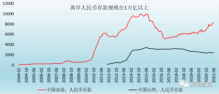 (3)離岸人民幣規模依然不高,中國香港與中國臺灣的人民幣存款分別僅為8211.92億元和2412.37億元,即便加上其它離岸人民幣市場(新加坡為161億元),離岸人民幣規模也僅為1.10萬億元左右,僅為國內全部存款規模的0.50%。