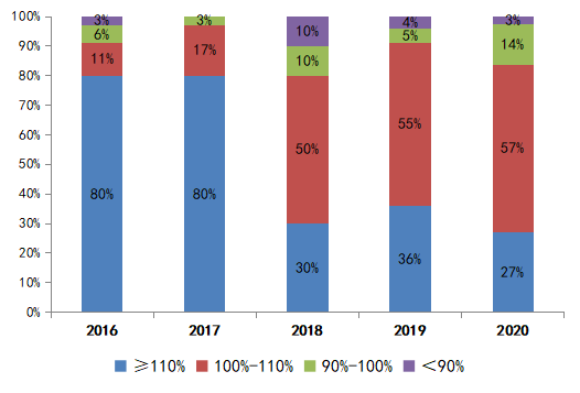 而從2020年房企的目標完成情況來看,受疫情影響,2020年企業(yè)整體的業(yè)績完成情況不十分理想,目標完成度超110%的房企數(shù)量不及2019年,僅占提出全年業(yè)績目標房企的27%,為近5年最低。