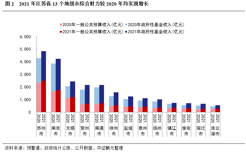 2021年蘇州、南京和無錫GDP規模繼續處于領跑地位,但泰州、淮安和鎮江GDP增速高于同期江蘇省GDP增速。2021年江蘇省13個地級市GDP規模均有所提升,但排位順序未發生變化。從GDP規模看,2021年GDP規模突破萬億的地級市依舊是蘇州、南京、無錫和南通,數量較2020年無變化。2021年,蘇州、無錫和南京GDP總和占江蘇省GDP的45.61%,較2020年下降0.49個百分點。蘇北地區中宿遷、連云港和淮安GDP規模依舊偏弱,依舊處于省內最后三位。從GDP增速來看,2021年由于疫情得到有效控制,各地級市GDP增速均高于2020年。2021年,南京、揚州和鹽城GDP增速低于同期江蘇省GDP增速,泰州、淮安和鎮江雖然廣義債務負擔較重,但2021年GDP增速明顯高于同期江蘇省GDP增速,其余地級市GDP增速基本和江蘇省GDP增速持平。