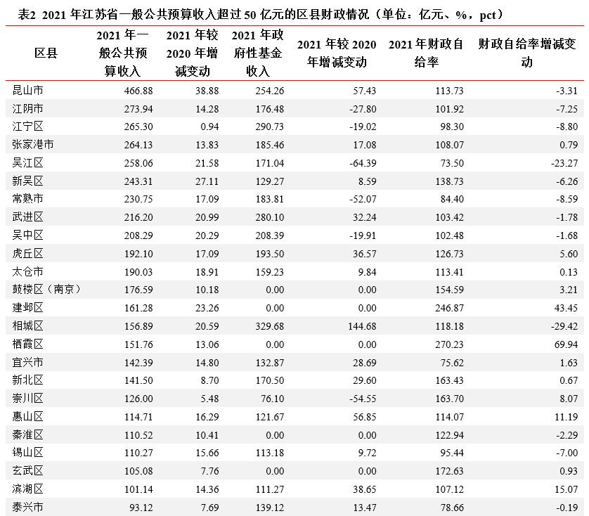 2021年江蘇省絕大部分區縣一般公共預算收入較2020年均有增長,但18個區縣政府性基金收入下滑,33個區縣財政自給率表現弱于2020年。一般公共預算收入方面,2021年昆山、江陰和江寧區一般公共預算收入仍穩居頭部,邗江區一般公共預算收入較2020年下滑5.70億元至54.41億元。受2021年房地產市場疲軟影響,2021年江蘇省有18個區縣政府性基金收入較2020年有所下滑,其中吳江區下滑幅度最大,當年政府性基金收入下滑64.39億元至171.04億元。2021年崇川區、常熟市和江陰市政府性基金收入較2020年分別下滑54.55億元、52.07億元和27.80億元。財政自給率方面,2021年江蘇省95個區縣中有33個區縣財政自給率表現弱于去年,相城區、京口區、天寧區、吳江區和鐘樓區財政自給率較去年同期下降20個百分點以上。