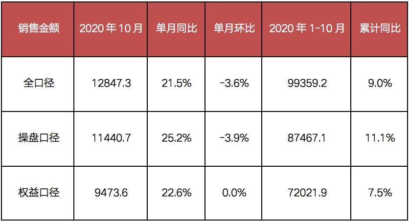 從累計銷售金額來看,1-10月房企全口徑銷售金額達到99359.2億元,逼近10萬億元,操盤金額累計達到87467.1億元,同比增長11.1%。