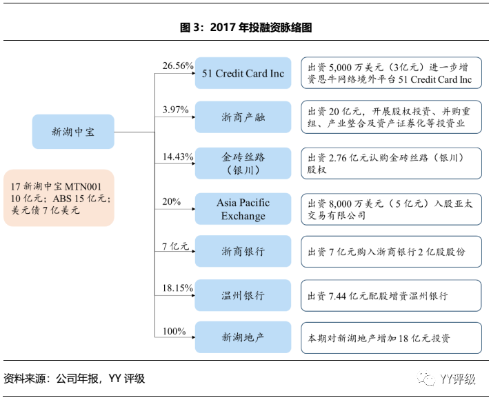 從合并報表來看,可供出售金融資產增加53億元,主要為對金融科技投資增加,包括:(1)完成對恩牛網絡的7億元增資,以及進一步增資恩牛網絡境外平臺51 Credit Card Inc 5,000萬美元(人民幣3億元);(2)出資20億元設立浙商產融投資合伙企業;(3)出資3億元認購金磚絲路(銀川)股權;(4)出資8,000萬美元(人民幣5億元)入股亞太交易有限公司;(4)出資7億購入浙商銀行2億股股份;(5)出資22億港元(人民幣18億元)參與中信銀行(國際)增資擴股。綜合來看,2017年公司境內外合計發行債券70億元,70億元用于布局金融領域。