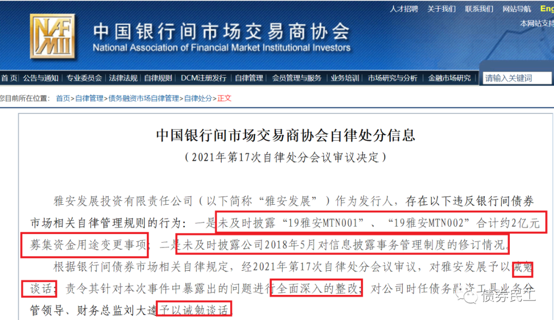 2、根據中國銀行間市市場交易商協會2021年10月29日披露的信息,雅安發展投資有限責任公司因未及時披露“19雅安MTN001”、19雅安MTN002”募集資金用途變更、未及時披露對信息披露事務管理制度的修訂,被交易商協會自律處分。處分措施包括對公司的誡勉談話、全面深入的整改以及對高管的誡勉談話。