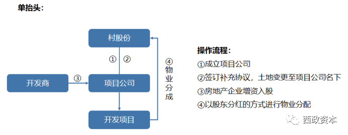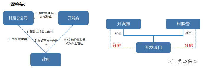 需注意的是,單抬頭的合作模式下,因項目公司分配給村股份公司的物業無法做稅前扣除,因此在土地成本(如非農或征返用地的出讓金)很低的情況下綜合稅負就會高很多,另外開發商完成項目的開發建設并在分配物業的過程中,因項目公司分配給村股份公司物業需按視同銷售處理,因此在土地成本很低的情況下相當于開發商還要額外掏出現金去繳納分配物業過程中的巨額稅費,由此就催生了雙抬頭的合作模式。