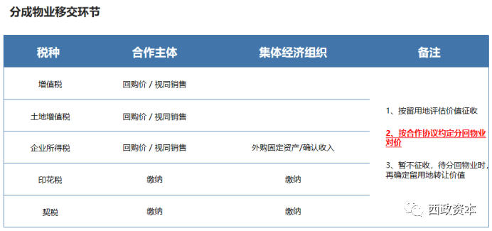 需注意的是,廣州的村集體留用地合作開發模式,因為在一開始的時候村集體就將留用地的土地使用權轉讓給了開發商,因此開發商建成物業后分房給村集體就涉及稅費的繳納問題。根據《廣州市城市更新稅收指引(2021年版)》,物業分成環節可分為以下二種情況: