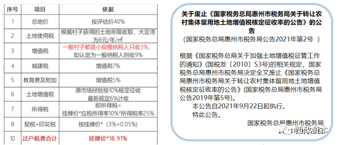 有個問題需要特別留意,在留用地掛牌轉讓的過程中,村集體需按土地使用權的轉讓繳納各種稅費,其中先前的土地增值稅核定征收率已在2021年9月22日廢止(詳見下圖)。