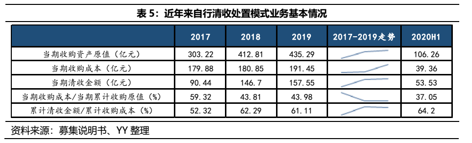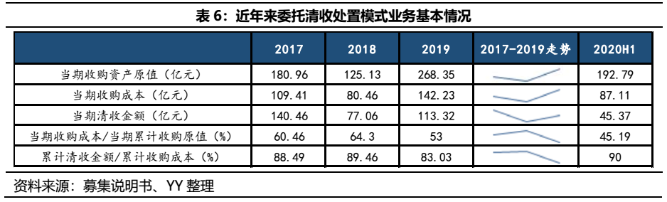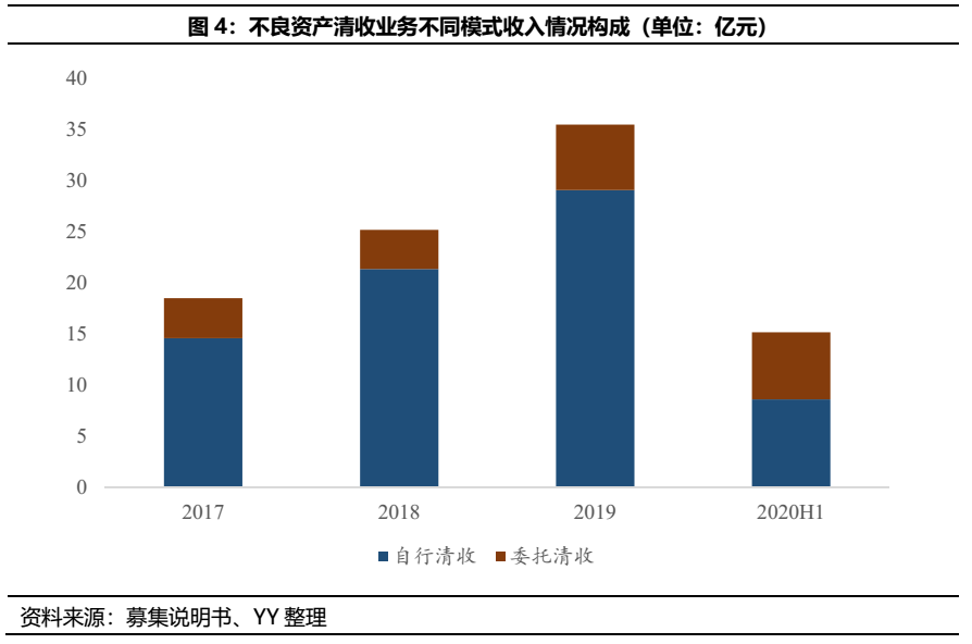 具體業(yè)務(wù)模式上,公司通過自行清收及委托清收兩種模式來實現(xiàn)不良資產(chǎn)處置,委托清收模式主要是公司成立之初不良資產(chǎn)處置經(jīng)驗及能力不足時用于規(guī)模擴張的權(quán)宜之計,目前公司已不再新增委托銀行清收類業(yè)務(wù)(接受其他金融機構(gòu)委托的模式仍在延續(xù)),對現(xiàn)有存量逐步消化,收益更高的自行清收模式成為主角。