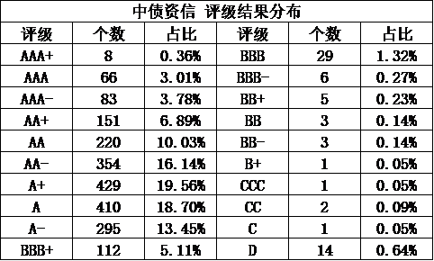 中債資信的評級符號比較特殊,多了AAA+、AAA-,且評級中樞分布于A+附近,大大增加了了區分度,成為我國信用債評級機構中的一股清流。