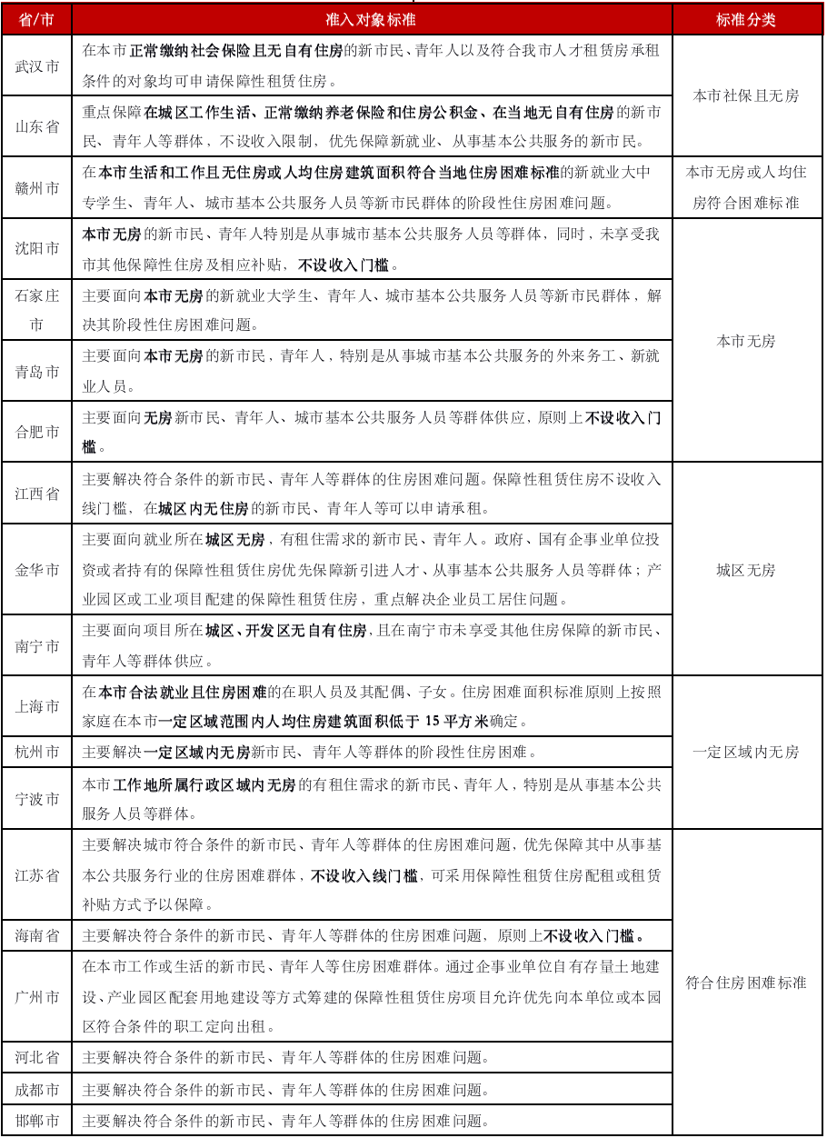 對象標準:關于保障性租賃住房準入對象上各城市存在較大差異,具體可以分為本市社保+無房、本市無房、城區無房、一定區域內無房、符合住房困難標準五大類。