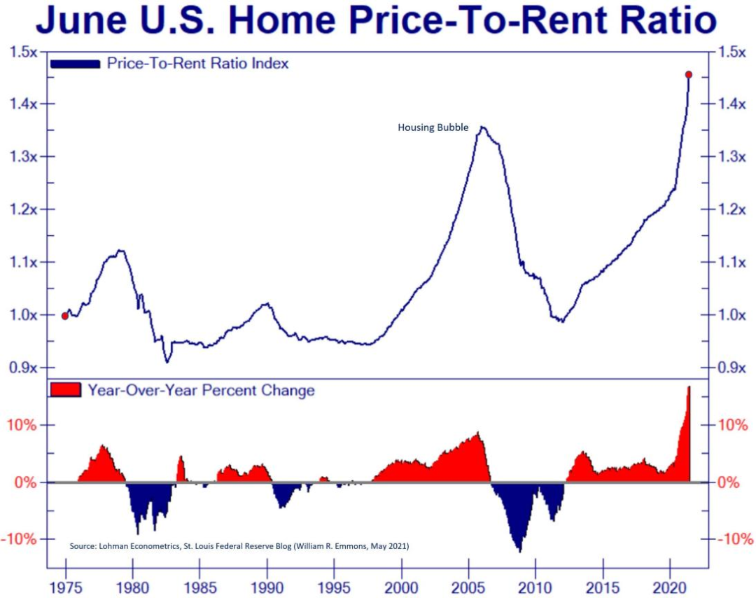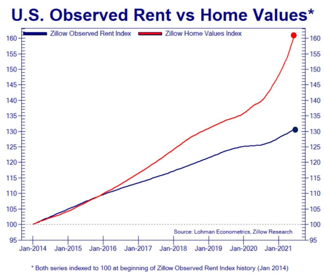 特別是高地價問題突出,也是困擾美國公寓運營商的難題。上圖反映了2014年以來Zillow(全美最大的在線房源網絡)房價與租金指數的分歧,即房價上漲快過房租上漲,表明出租型公寓也面臨客觀上租金回報率的降低。下圖則反映了房價租金比的趨勢,經過2012年以來持續的房地產牛市,特別是2020年以來的房價上漲,房價租金比刷新次貸危機的峰值,進一步顯示租金回報降低的壓力。
