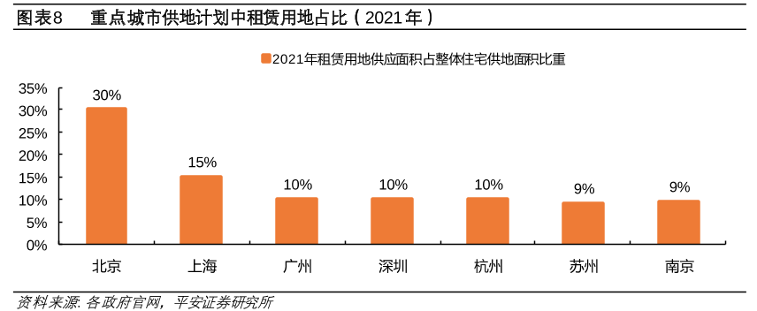 如上圖所示,2021年全國重點城市租賃住房用地的供應面積,只有北京達30%,上海、廣州等其他城市位于9%~15%的水平,供應規模在居住用地中的比例偏少,可見盡管監管部門一再呼吁,但地方從源頭上做大租賃住房市場的動力仍不足。