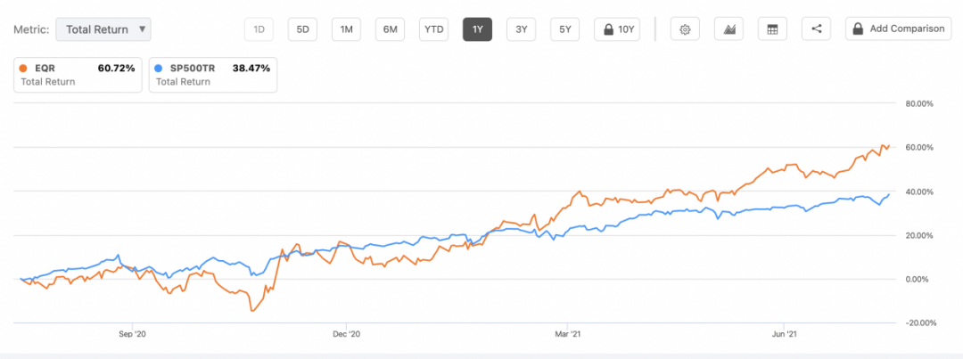 尤其今年5月,美國新房建設成本同比增長11%,這是自1980年以來最高值(如上圖所示)。過去40年大部分時間美國建筑成本都在上升,加上受到通脹回升及通脹交易的雙重提振,美股市場REITs的平均回報率超過25%,其中公寓REITs更是超過35%,大幅跑贏行業及美股主要股指,同類資產中表現僅次于私人倉儲REITs。但從規模而言,20只公寓REITs總市值超過2100億美元,是美股市場REITs的絕對權重之一,有如此回報彈性也著實驚人。