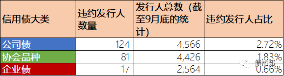 用違約發行人數量作為分子,發行人數量作為分母,也是個不錯的的對比口徑,現在發行過公司債、協會品種和企業債的發行人數量大概分別是4566、4426和2564家,已經正式宣告違約的發行人數量分別是124家、81家和17家。