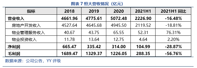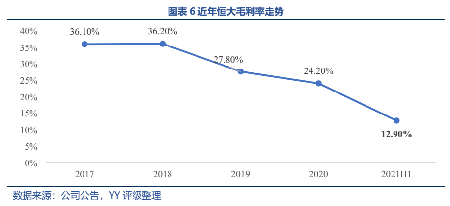 從恒大歷年的拿地及存量土儲情況來看,公司的土儲持續在降低,2020年土儲降低了約6,000萬平,2021年上半年又繼續降低了約1,600萬平。但其實公司新增土儲的力度也不低,2019年、2020年新增購地金額分別達到1,408.3億元、1,372.9億元,雖然相較16、17年有所減少,但考慮到公司的目前資金壓力、存量土儲建面尚可滿足約5年銷售的情況,這樣的支出力度顯得有些大了。2021年上半年,公司拿地力度有明顯下降,購地金額僅314億元,但由于2020年拿地較多,以及一些已預售的房屋也需要進行后續開工以保證交房,因此我們看到上半年結轉了近2,000億營業成本的情況下賬面存貨仍然不減反增,并未實現真正的縮表。