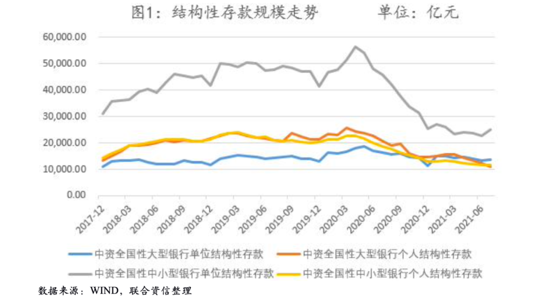 智能存款、結構性存款監管趨嚴,靠檔計息存款產品被叫停,存款業務逐步規范。商業銀行存款產品類型除定期存款、活期存款、大額存單、通知存款等傳統存款產品外,還包括結構性存款與銀行智能存款等“創新”存款產品。為增強存款業務吸引力、豐富金融產品體系,以中小銀行為主的部分商業銀行開展與利率、匯率、指數等波動掛鉤的結構性存款業務,結構性存款規模處于較高水平;但結構性存款業務的發展也帶來了高息攬存、資金面寬松背景下的套利和資金空轉等問題。為此,中國銀行保險監督管理委員會(以下簡稱“銀保監會”)于2019年10月末發布《關于進一步規范商業銀行結構性存款業務的通知》,在12個月過渡期內,商業銀行可以繼續發行原有的結構性存款,但應當嚴格控制在存量產品的整體規模內,并有序壓縮遞減;對于過渡期結束前已經發行的結構性存款,商業銀行應當及時整改,到期或兌付后結清。2020年,中小銀行結構性存款規模僅有前4個月的余額正向增長,此后結構性存款規模呈快速下降態勢(見圖1);相對于大型銀行來說,中小銀行對結構性存款依賴程度更高、規模壓降幅度更大。截至2021年6月末,中小型銀行結構性存款余額已壓降至34617.89億元,較2020年最高點下降56.22%;大型銀行余額為25785.41億元,較2020年最高點下降39.60%。