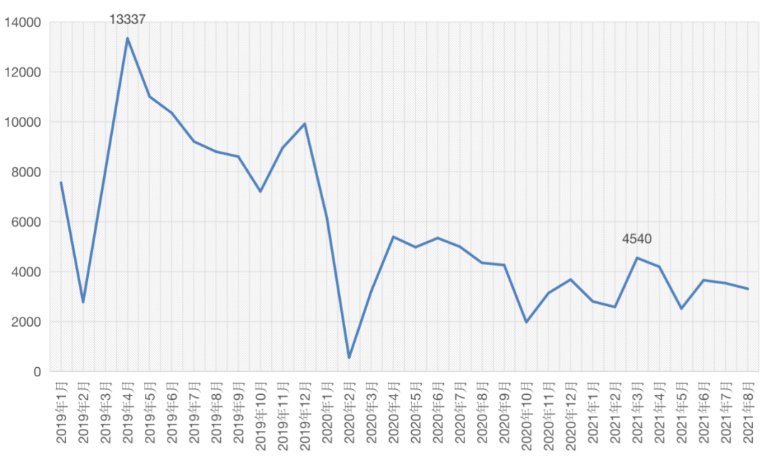 圖:2019年1月-2021年8月成都二手住宅成交套數(shù)走勢(單位:套)