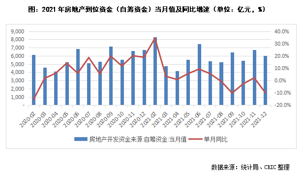 從自籌資金來看,12月房地產(chǎn)開發(fā)企業(yè)到位資金——自籌資金為6050億元,同比下降9.8%,較2019年同期增長7.1%,同比增速在11月由負(fù)轉(zhuǎn)正后再次回負(fù)。全年來看,2021年累計值達(dá)到65428億元,同比增長3.2%,增幅較前11月的4.8%進(jìn)一步收窄,在當(dāng)前整體融資環(huán)境收緊下,多個融資渠道均被封堵,雖部分企業(yè)通過多種方法自救充裕現(xiàn)金流,但大部分房企自有籌集資金能力有限,資金增幅有限。