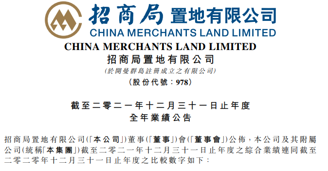 日前,地產大咖招商蛇口旗下的小弟招商局置地,發布了其2021年業績公告。