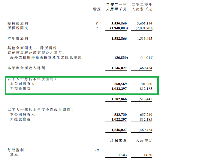 更蹊蹺的是,非控股權益部分的凈利高達10.22億元,2020年為8.12億元——這利潤的結構,實在是好玩。