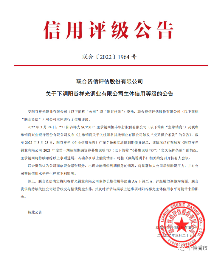 3月25日,聯合資信公告稱,將陽谷祥光銅業(yè)有限公司(以下簡稱“陽谷祥光”)主體長期信用等級由“AA”下調至“A”,評級展望調整為負面。