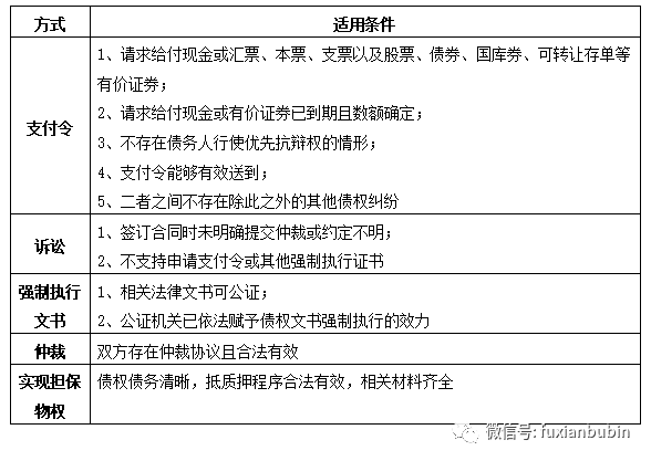 即通過民事訴訟、民商事仲裁、民事督促(支付令)、執(zhí)行公證債權(quán)文書、直接向法院申請實現(xiàn)擔(dān)保物權(quán)的方式,確立債權(quán)的合法性,依靠強制程序收回債權(quán)的清收處置方式。主要適用于債務(wù)人出現(xiàn)生產(chǎn)經(jīng)營陷入困境、財務(wù)狀況嚴(yán)重惡化,債務(wù)履行困難,停止?fàn)I業(yè)或?qū)嶋H控制人下落不明,債務(wù)人還款意愿差,有明顯轉(zhuǎn)移資產(chǎn)或逃廢債務(wù)的行為,主要負(fù)責(zé)人或?qū)嶋H控制人涉及刑事案件等情形。其具體適用情形如下表: