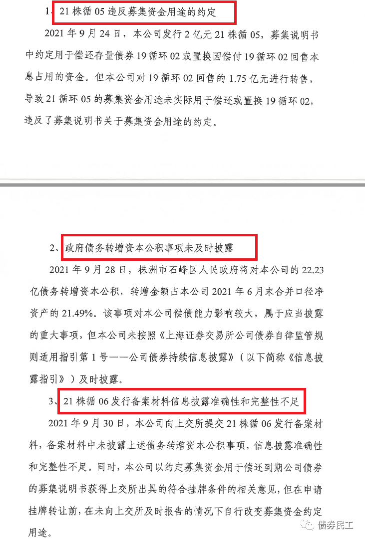 4、根據株洲循環經濟投資發展集團有限公司2021年11月26日披露的公告,公司因為“違反募集資金用途的約定”、“政府債務轉增資本公積事項未及時披露”和“發行備案材料信息披露準確性和完整性不足”等問題,被上海證券交易所出具于2021年11月22日出具監管警示函(上證債監[2021]46號)。