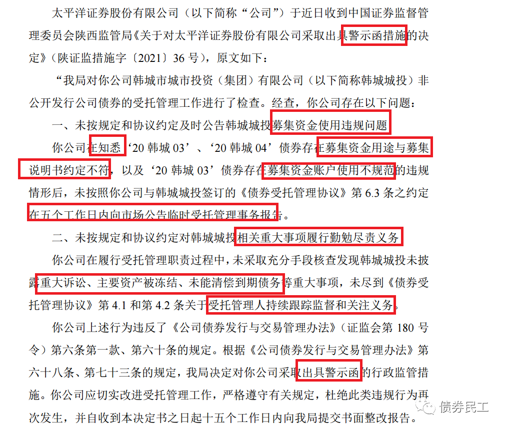 3、太平洋證券股份有限公司于2021年12月1日公告,陜西證監局對公司出具警示函,主要原因是未能及時披露韓城市城市投資(集團)有限公司(募集資金使用違規問題和未履行重大事項勤勉盡責義務。
