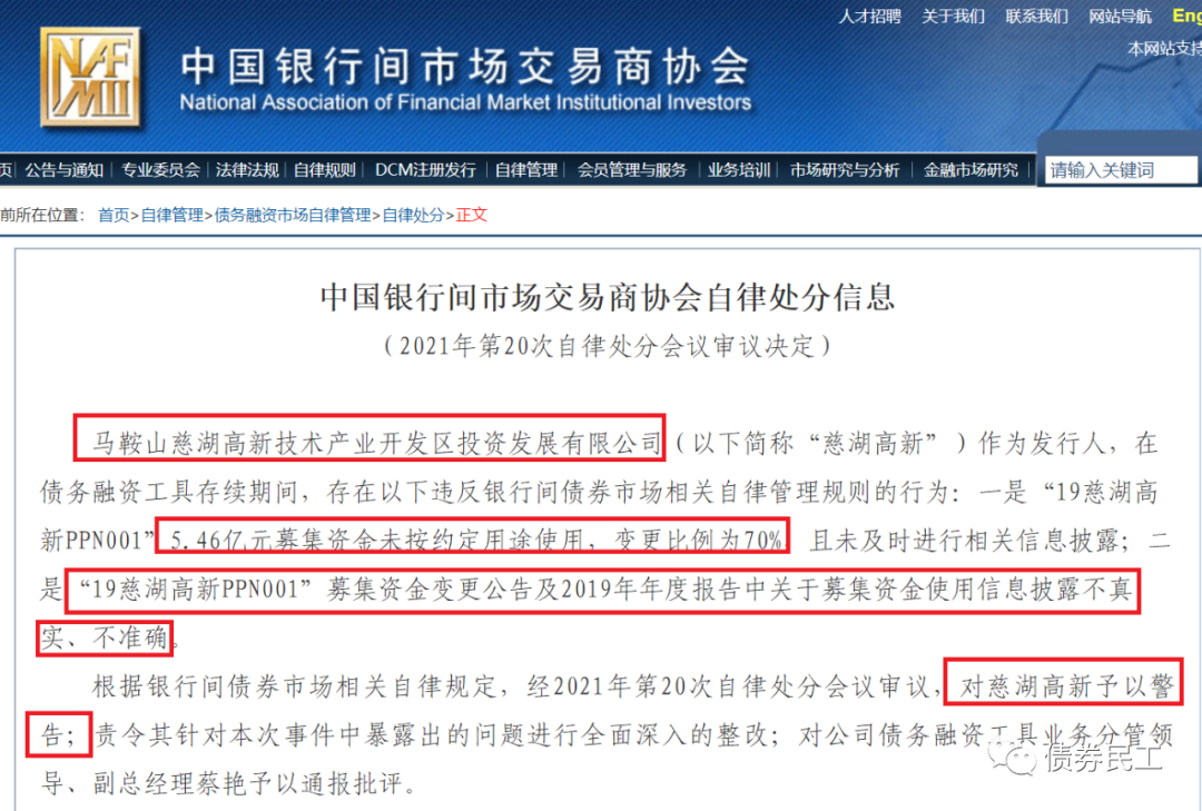 2、根據中國銀行間市場交易商協會2021年12月16日的公告信息,馬鞍山慈湖高新技術產業開發區投資發展有限公司因為“19慈湖高新PPN001”未按照約定使用募集資金、募集資金變更公告信息不真實不準確等原因,交易商協會對發行人予以警告。