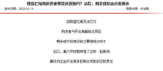 近期, 嘉興市中級人民法院于官網公布的一篇題為《樓盤爛尾購房者要繼續還按揭嗎?法院: 剩余貸款由開發商還》的案例報道, 引起了市場的廣泛關注。根據該報道, 在樓盤“爛尾”后, 對于銀行要求購買者繼續歸還剩余銀行貸款的訴訟請求, 嘉興中院不予支持, 并認為應由房地產開發商繼續承擔剩余貸款的還款責任。
