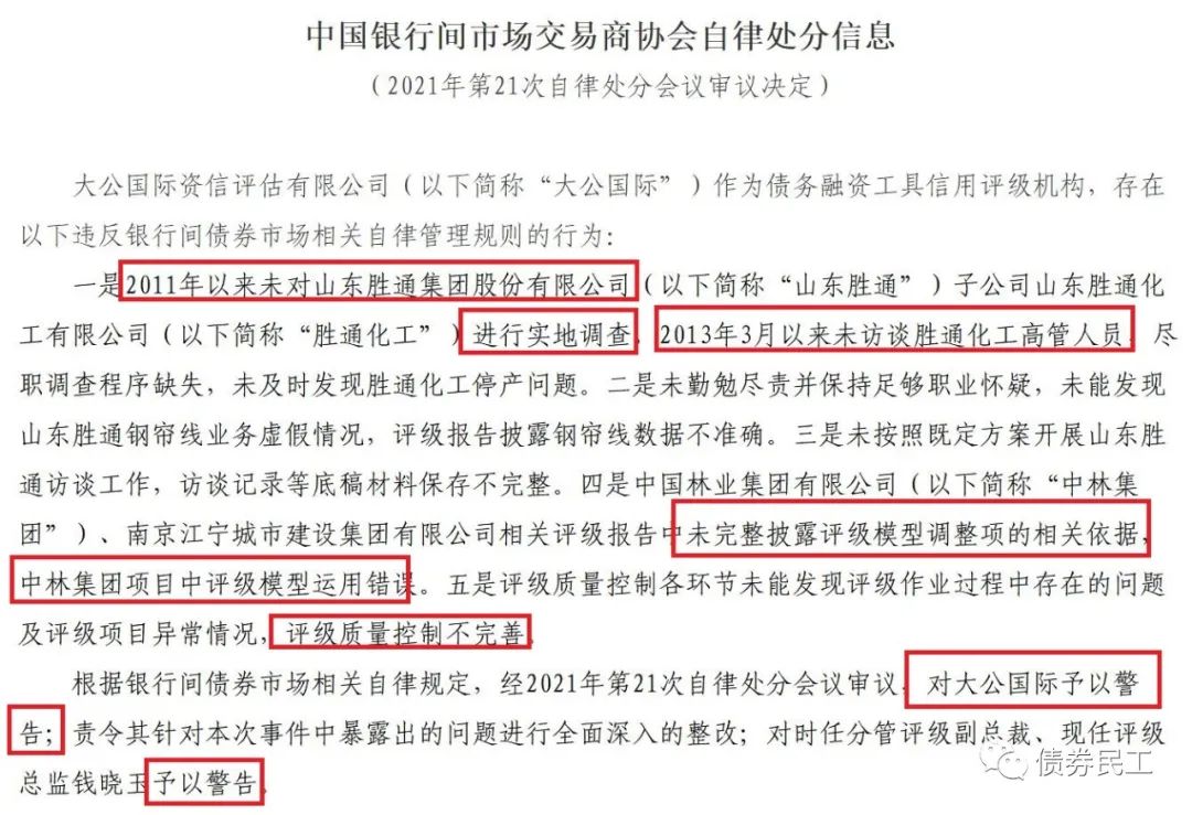 根據(jù)中國銀行間市場交易商協(xié)會2021年12月16日的公告信息,大公國際資信評估有限公司因為個別項目中存在盡職調查程序缺失、未勤勉盡責、未披露評級模型調整項的依據(jù)以及評級質量控制不完善等問題,被予以警告。