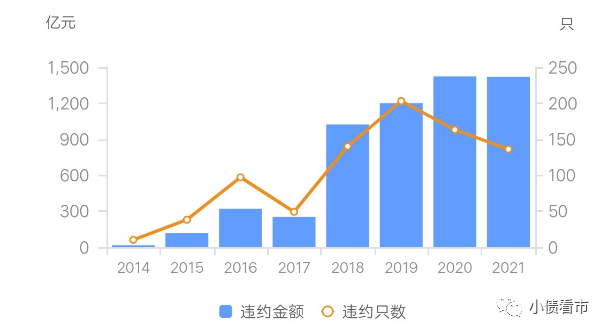 《小債看市》統(tǒng)計(jì),2014-2021年信用債市場共計(jì)發(fā)生債券違約836只,違約金額高達(dá)5766.18億元。