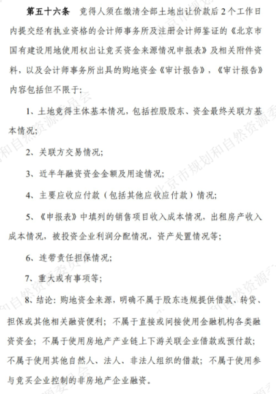 更為“苛刻”的還在于,購地資金審查方面,明確要求競得人在繳清全款后2個工作日內,提交《北京市國有建設用地使用權出讓競買資金來源情況申報表》及相關附件資料,以及會計師事務所出具的購地資金《審計報告》。上述申報表需經有執業資格的會計師事務所及注冊會計師進行鑒證。