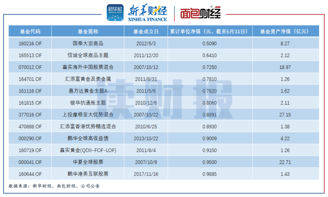 其他QDII基金中,信誠全球商品主題、嘉實海外中國股票混合、匯添富黃金及貴金屬等截至2022年5月31日的累計單位凈值也在0.8元以下。
