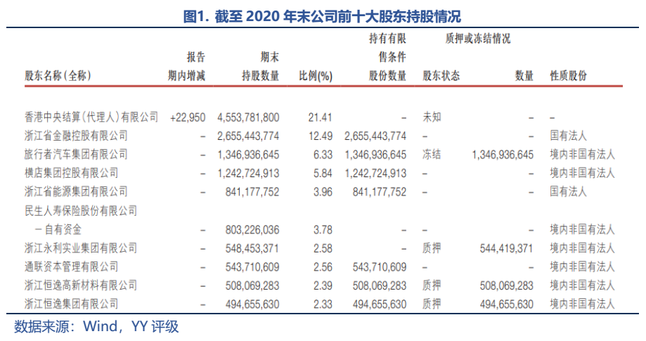 從股權質押情況來看,根據中證登的數據,截至2021年5月末,公司被質押的股票占流通A股的25.03%;永利實業、恒逸高新、恒逸集團的股權全部被質押,安邦系的重要成員旅行者集團19年想要清倉所持浙商銀行的全部股權,目前13.47億股涉及司法凍結。