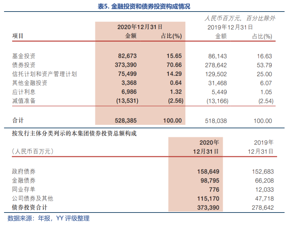2020年末公司資產中金融投資合計5283.85億元,占比25.80%,比上年末下降2.97%。金融投資主要配置了大部分的債券以及少部分的基金、信托及資管計劃,投資的非標不斷壓降,債券投資增加,結構有所優化;但債券投資中風險相對較高的公司債券占比30.84%,較2019年有很大增幅,其余以較為安全的政府債、金融債居多??傮w來看風格轉向求穩。