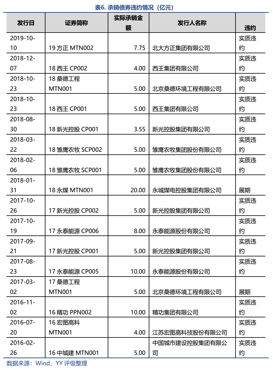 從2016年以來,公司承銷的債券涉及違約/展期共16只,承銷方式均為余額包銷,合計承銷金額107.30億元。這塊由銀行包銷的債券(具體規模無公開披露數據)的風險處置值得關注。