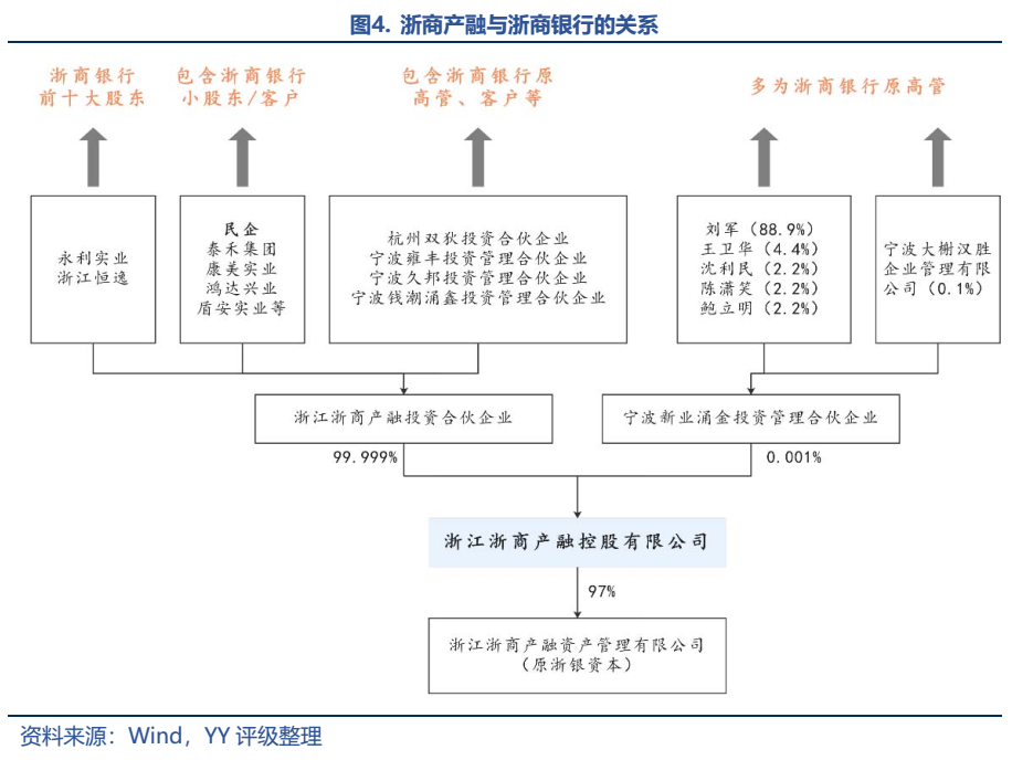 之前浙商銀行有一個表外運作平臺浙銀資本,后因在寶萬之爭中浙商銀行理財資金通過浙銀資本輸血130億給寶能,被監管要求與浙商銀行隔離;2017年升級為浙商產融(注冊資本1000億元,2018年到位250億元)。雖然浙商產融和浙商銀行乍一看并無股權關系,但穿透下來,其股東多為浙商銀行的股東、主要客戶、原高管等。