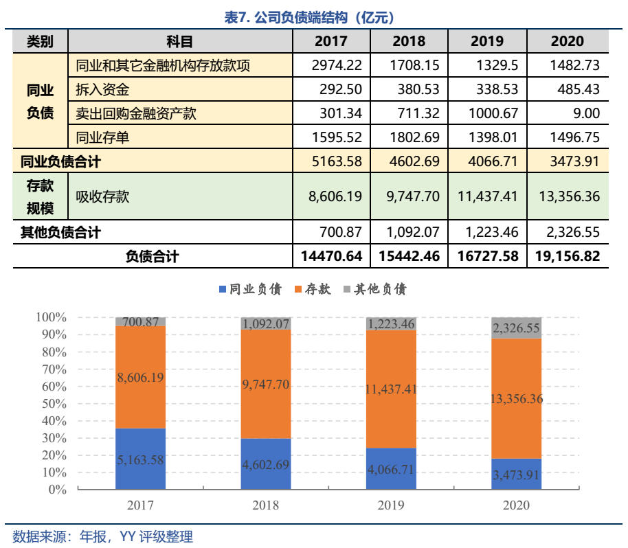 首先公司負債端的結構中,存款占比已經逐年增加至70%左右。存款大多是公司存款,截至2020年末零售存款占比僅19.17%,且其中大部分是個人定期存款,這也直接導致存款的成本高達2.64%。