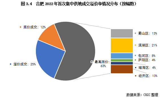 值得注意的是,雖然合肥本輪土拍溢價率明顯提升,有15宗地塊觸及最高限價,但流拍率依然居高不下,尤其是包河、廬陽區體量較大、周邊配套欠佳的地塊以及去化壓力較大的新站地多遭遇流拍,合計共有8宗地塊流拍,流拍率高達25%,在一季度完成首輪集中土拍的7個城市中僅次于福州,由此可見合肥土拍市場冷熱分化嚴重。
