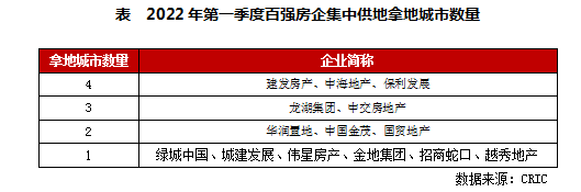 從企業投資角度來看,由于2021年較為嚴格的金融監管政策帶來的現金流壓力仍在,大部分房企在今年一季度仍未恢復投資力度,8個熱點城市的集中供地中百強房企拿地金額占比約為一半,其中建發、中海、保利等少數房企表現較為突出,布局范圍也相對較大。