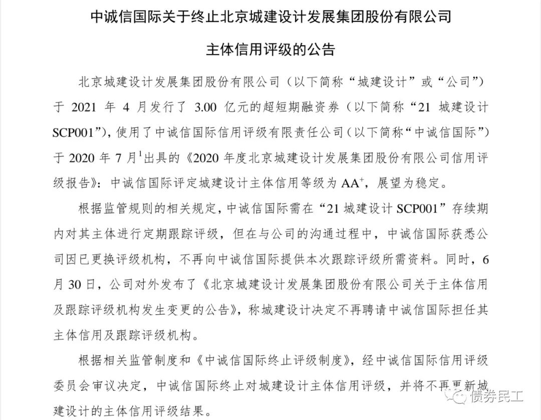 1、2021年7月8日,中誠(chéng)信國(guó)際公告,終止北京城建設(shè)計(jì)發(fā)展集團(tuán)股份有限公司(以下簡(jiǎn)稱“城建設(shè)計(jì)集團(tuán)”)主體信用評(píng)級(jí)報(bào)告,主要原因是發(fā)行人已經(jīng)更換了評(píng)級(jí)機(jī)構(gòu),不再向中誠(chéng)信國(guó)際提供跟蹤評(píng)級(jí)所需材料。