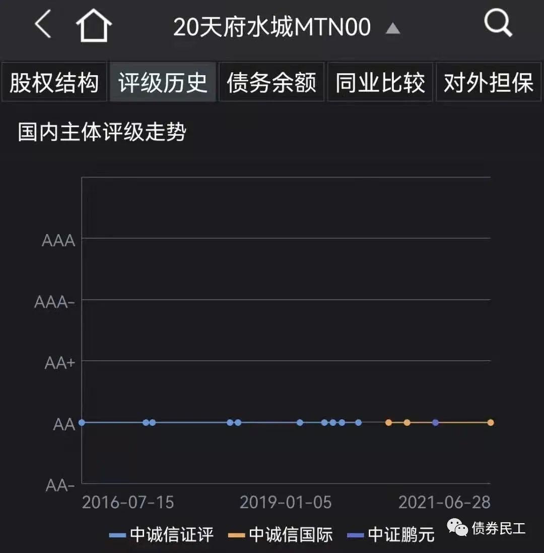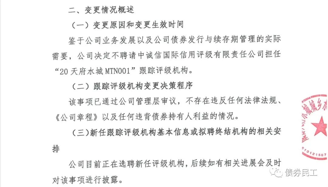 2、成都天府水城城鄉(xiāng)水務(wù)建設(shè)有限公司(以下簡(jiǎn)稱“天府水城”)于2021年7月8日披露了《關(guān)于擬變更跟蹤評(píng)級(jí)機(jī)構(gòu)和延期披露相關(guān)債券 2021 年跟蹤評(píng)級(jí)報(bào)告的公告》,“鑒于公司業(yè)務(wù)發(fā)展以及公司債券發(fā)行與存續(xù)期管理的實(shí)際需求”,不再聘任中誠(chéng)信國(guó)際為跟蹤評(píng)級(jí)機(jī)構(gòu),但是天府水城目前尚未確認(rèn)新的跟蹤評(píng)級(jí)機(jī)構(gòu)。預(yù)計(jì)中誠(chéng)信國(guó)際后續(xù)也會(huì)出具相應(yīng)的公告。