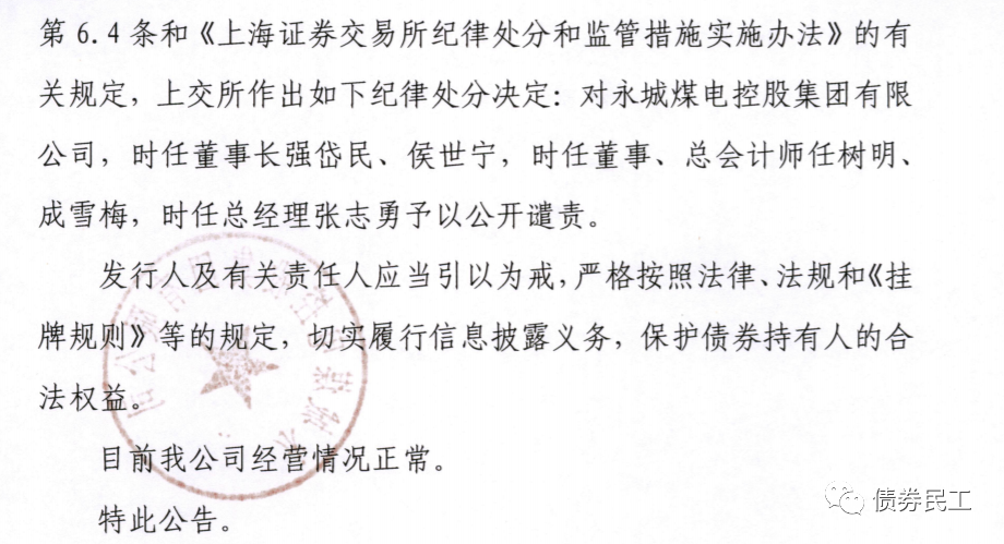根據永城煤電控股集團有限公司(以下簡稱“永煤集團”)2021年10月22日的公告,公司于10月20日收到上海證券交易所的紀律處分決定書,因涉在財務報告中嫌虛增貨幣資金,對永煤集團及時任高管進行公開譴責!