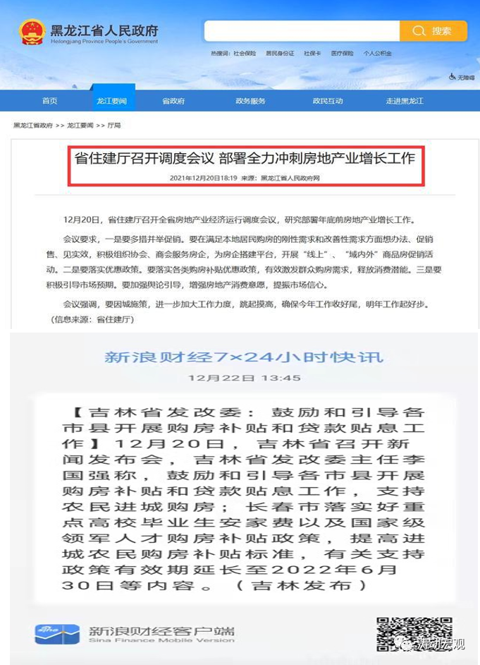 例如,2021年12月20日,黑龍江省政府發(fā)布《省住建廳召開調(diào)度會(huì)議部署全力沖刺房地產(chǎn)業(yè)增長工作》(21日這一新聞便官網(wǎng)被撤下),稱黑龍江省住建廳召開全省房地產(chǎn)業(yè)經(jīng)濟(jì)運(yùn)行調(diào)度會(huì)議,要求要想辦法促銷售,落實(shí)購房補(bǔ)貼政策,提振市場信心。