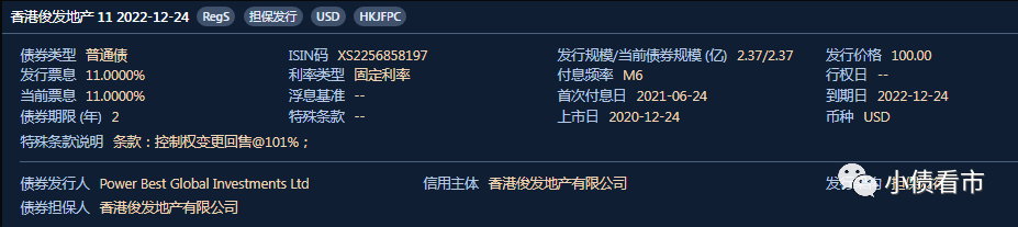 在離岸債券方面,主要由香港俊發地產有限公司(以下簡稱“俊發地產”)發行,目前僅存續一只美元債,存續規模2.37億美元,票息11%,將于今年12月24日到期。