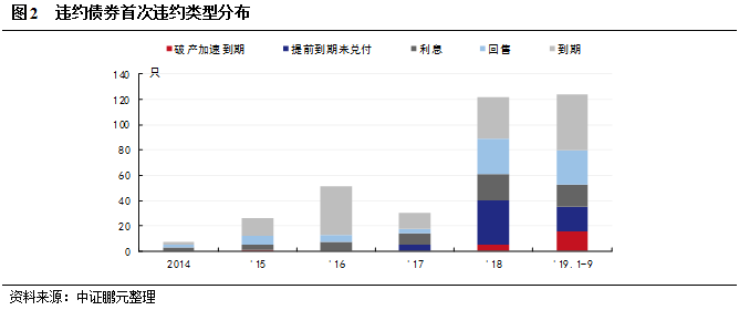 違約類型多樣化,以利息違約和回售違約最為常見。一方面,由于2015年債券市場擴容后,設置回售條款的新發行債券增多,常見的如“2+1”、“1+1+1”、“3+2”、“5+2”,回售權行使加速了債券的到期時間;另一方面,擴容后發行的債券設置回售條款或投資者保護條款增多,觸發條款而導致其他債券加速到期。因此,2018-2019年,因回售行權以及觸發條款加速到期而違約的債券的比例大幅度上升。