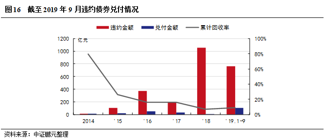 根據已有公開信息,截止2019年9月30日,126家違約主體進行了進行兌付的34家(全額兌付18家,部分兌付的16家),360只違約債券有進行兌付的49只(全額兌付28只,部分兌付20只),累計兌付金額217.01億元(其中累計本金兌付201.62 億元),累計回收率8.65%。隨著剛兌打破以及債券違約的常態化,違約兌付由2014年的約80%的回收率逐步下降,2018-2019年回收率不足10%。